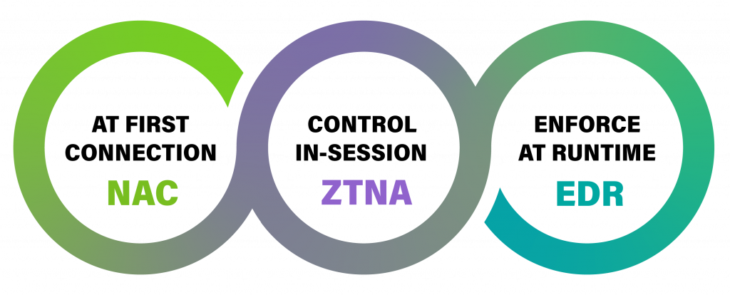 - In Session: NAC-anchored ZTNA enforces identity-bound access throughout the session..